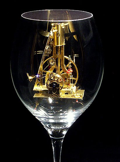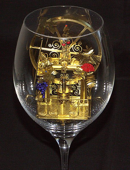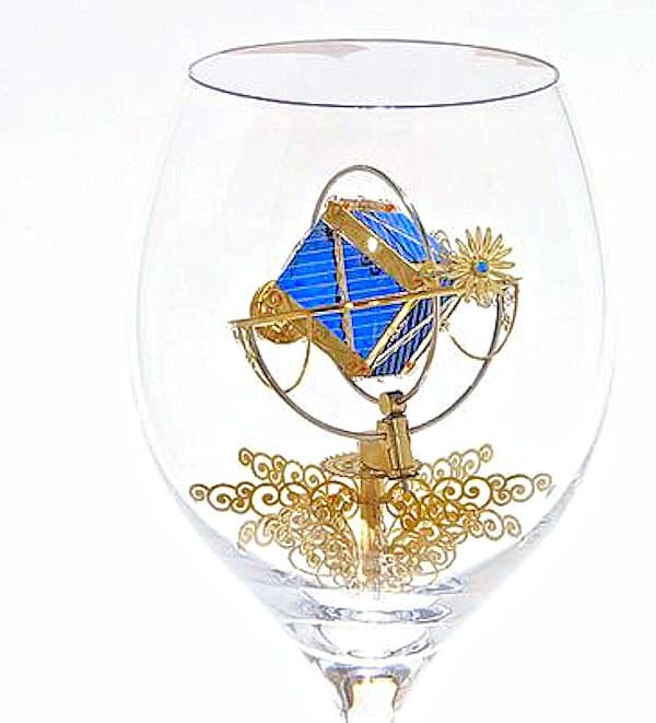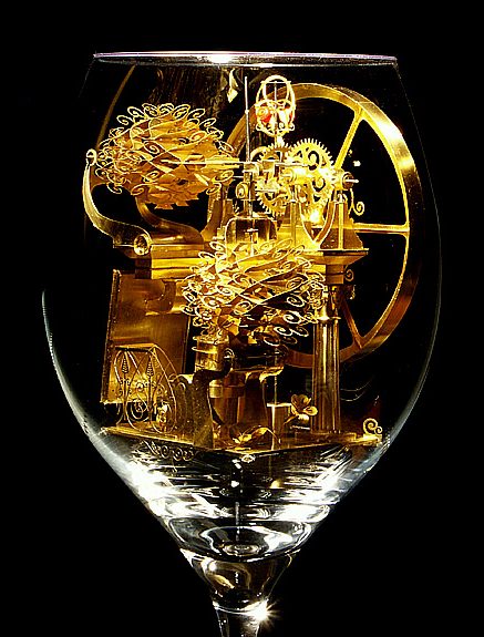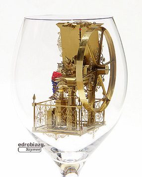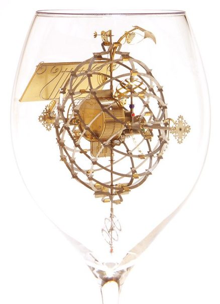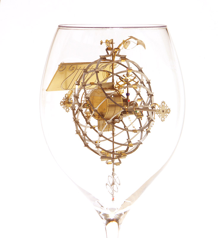 Made from 0.1 millimeter sheets of brass and bronze, Klimek’s miniature machines dance effortlessly in wine glass enclosures than measure little more than 4 inches across.