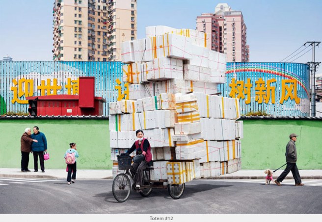 Inspired by the men on bicycles toting impossible mounds of objects he witnessed in Shanghai, French photographer Alain Delorme defies physics with his “Totems” series.