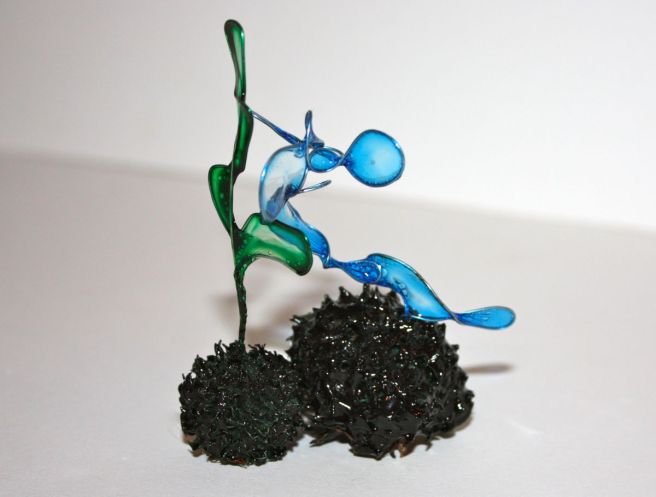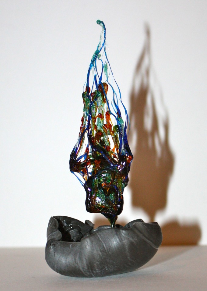 She works with photography, painting, and glass works.