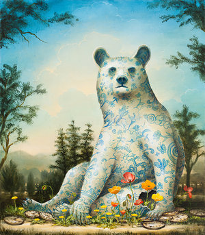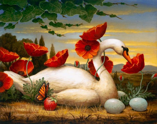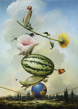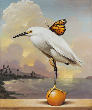 The often symbolic paintings are an ongoing inquiry into the relationship between the marvel of the natural world and the mundane and often blunt reality of the modern era.
