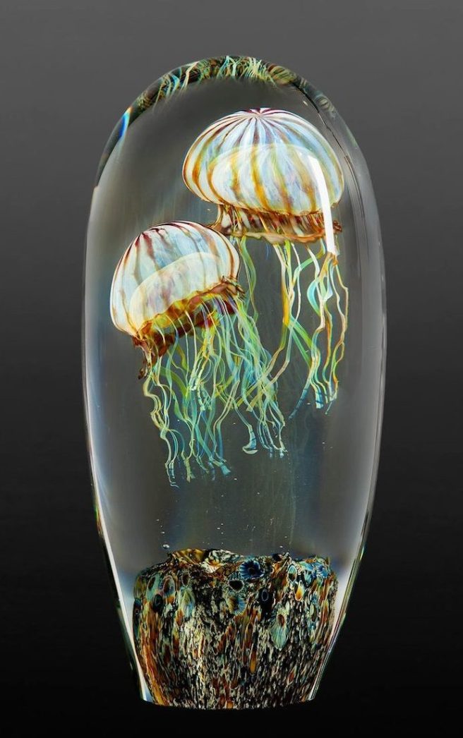 The California-based artist uses a technique in his sculptures called “glass-in-glass,” which consists of a glass sculpture being dipped into a second, molten glass layer.