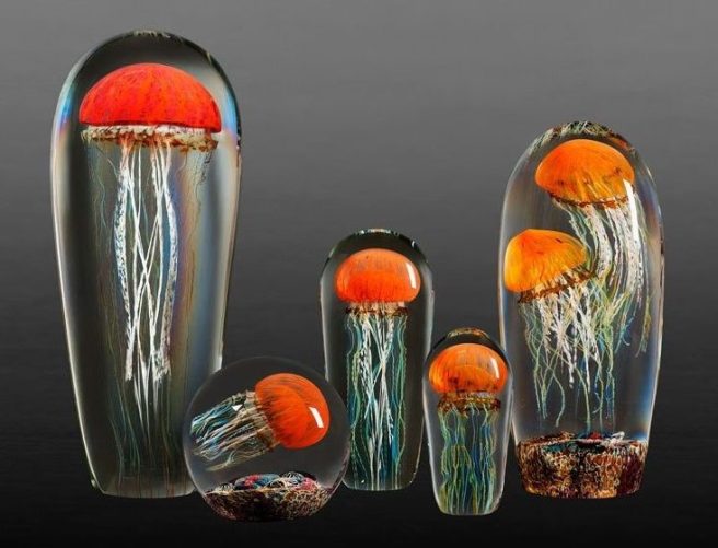 The bright jellyfishes Satava creates are suspended in the glass that surround them, yet each still appears as if their tentacles are rippling through the water.