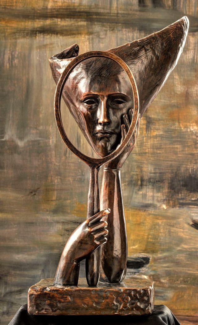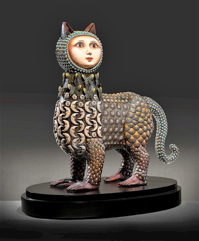 Sergio Bustamante is a Mexican sculptor best known for his depictions of animals and inventive humanoid creatures.Born in 1942 in Sinaloa, Mexico, he went on to study architecture at the University of Guadajara, leaving before he finished his degree in order to focus on craftmaking and fine art.Bustamante infuses every one of his creations with such life and love and a limitless passion for both, that there’s no question that only someone very much connected to his ancestors, to his culture, to the cosmos and to the unknown could be responsible for such wild, wondrous and beautiful creations.Working in papier maché, wood, bronze, and ceramic, Bustamante’s sculptures are often painted or glazed, allowing him to bring even greater heights of imagination and surrealism to his creatures.One of the more compelling forms he continues to explore is his bronze and ceramic sculptures.Often cast of the same strange and surreal creatures who inhabit his paintings (fish-headed humans, mystical figures draped in heavy dresses, and plenty of half-moons and half-suns), Bustamante has grown to love his bronzes and ceramics more and more.“Colors are more poetic,” he says, “but the bronzes and ceramics are more abstract.” Many of Bustamante’s works are as magical as they are known.“Magic is something in your mind, something you help to create,” emphasizes Bustamante, who uses colors and design the way a poet uses words.