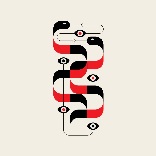 The pieces combine black and red shapes and linework to form stylized versions of animals and insects.
