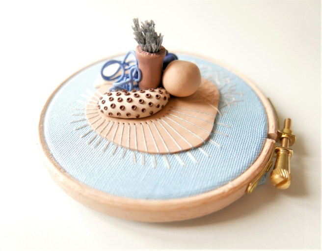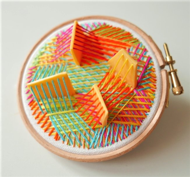 She specializes in combining tiny abstract sculptures (made of bright colored polymer clay) with traditional art of stitching by hand.