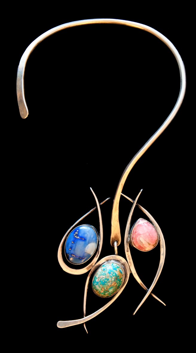 Inspired by surrealism, biomorphism, and primitivism, Smith’s jewelry included large scale, asymmetrical forms made from hand-hammered elements of silver, copper, or brass, sometimes combined with quartz or other colorful stones.