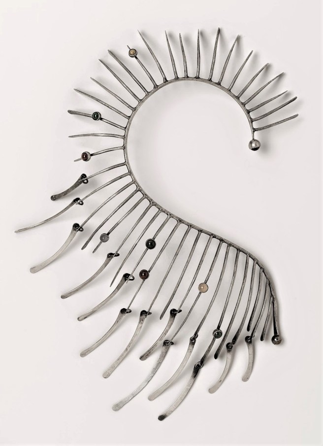 Inspired by surrealism, biomorphism, and primitivism, Smith’s jewelry included large scale, asymmetrical forms made from hand-hammered elements of silver, copper, or brass, sometimes combined with quartz or other colorful stones.