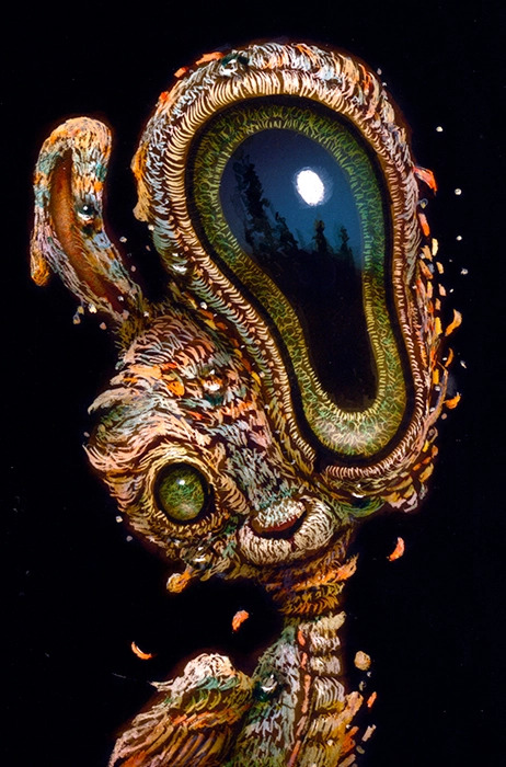 “The creatures in the paintings are avatars for entering the world of my imagination. The eyes feel like an entrance to the world of visionary memories.