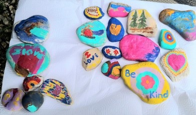 So the next day we bought some acrylic paints and found a handful of flat rocks throughout the campground and had a paint fest. All ages joined — four-year-olds through 70-ish flower children. Some of us wrote a message, others made abstract designs.