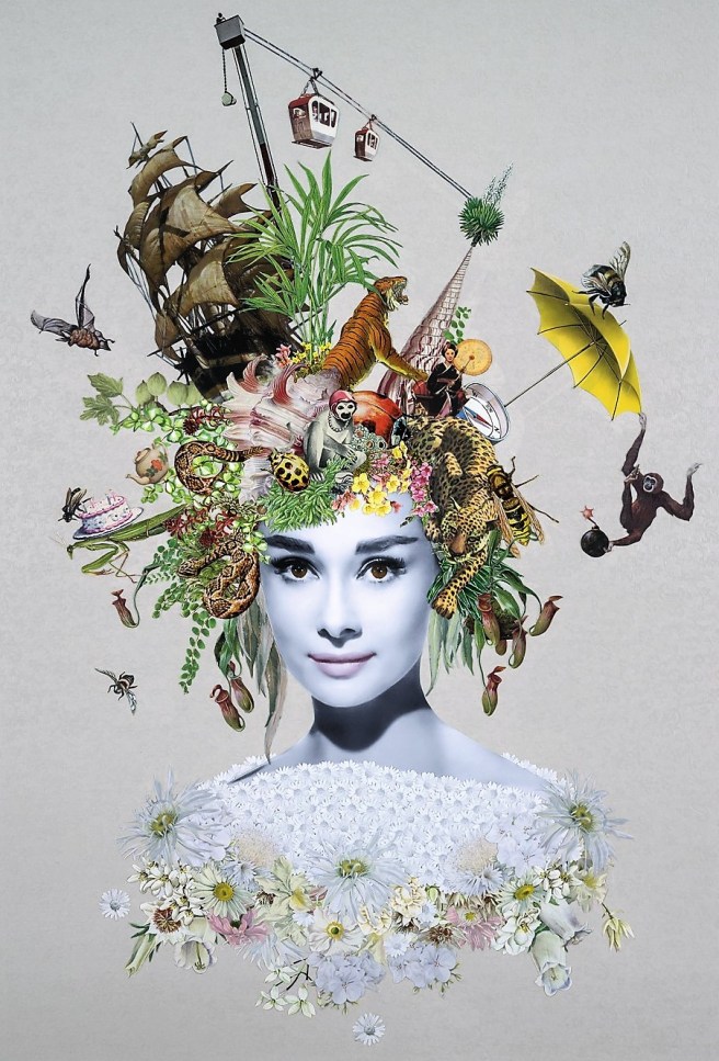 Maria Rivans is a contemporary British artist known for her scrapbook-style collage artwork.A mash-up of Surrealism meets Pop-Art, Rivans’ work re-appropriates vintage collectables to create dreamy realms which transport the viewer into fantastical worlds of the imaginary, each one suffused with vivid color, arresting imagery, and intricate detail.Rivans’ collages have a firm running theme of vintage Hollywood films, B-movies and old television shows. Her process begins with her extensive collection of vintage papers which she scavenges from antique books and retro magazines.She is always on the look-out for that perfect ‘something’ in second-hand shops and at market stalls.Like piecing together an unruly jigsaw puzzle, Rivans begins to collate and assemble the skillfully cut-out fragments and scraps, laboring over long periods and making alteration after alteration, until the collage begins to take shape.Through an intense attention to detail and an artistic sensitivity to color and composition, each of Rivans’ artworks is the product of months of careful deliberations and decisions.Her collages are fun, inventive, and full of familiar faces and extensions. The collage pieces that stand in for the hairdos of movie stars of the past create a harmony and connection between today and yesterday.