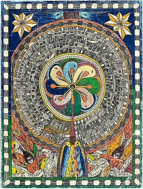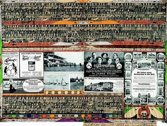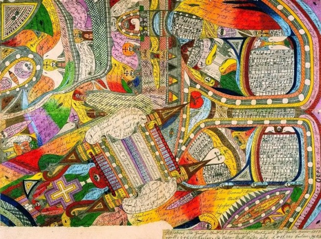 Adolf Wölfli (1864–1930) was a Swiss artist who was one of the first artists to be associated with the Art Brut or “outsider” art label.Wölfli was abused both physically and sexually as a child, and was orphaned at the age of 10, leaving him to grow up in a series of state-run foster homes.He was very disturbed and sometimes violent on admission, leading to him being kept in isolation for his early time at hospital. He suffered from psychosis, which led to intense hallucinations.At some point after his admission Wölfli began to draw. His first surviving works (a series of 50 pencil drawings) are dated from between 1904 and 1906.A doctor at the Waldau Clinic took a particular interest in Wölfli’s art and his condition, later publishing Ein Geisteskranker als Künstler (A Psychiatric Patient as Artist) in 1921 which first brought Wölfli to the attention of the art world.Morgenthaler’s book detailed the works of Wölfli who seemed to have no previous interest in art and who developed his talents and skills independently after being committed for a debilitating condition.In this respect, Wölfli was an iconoclast and influenced the development and acceptance of Art Brut.At a glance, Wölfli’s work oozes the sentiments of Psychedelic art with its kaleidoscopic swirls of colorIn truth, they’re the relics of a man orphaned in the 1800s, whose life was bookended by the abuse he both received and committed.But that madness also incubated one of the most jaw-dropping works in Art Brut history: Wölfli will paint, compose music and write a semi-biographical book that has 45 volumes, approximately 25,000 pages, and more than 1.600 illustrations that is filled with reptiles, knights, dancing shadows; and insect musicians, along with Algebra and melancholic sheet music.Wölfli’s work has been described as one of the three or four most important a  bodies of work constituting an artist’s lifework of of the twentieth century.More of Adolf Wölfli‘s mesmerizing artwork can be found at https://www.adolfwoelfli.ch/ and  Adolf Wölfli: mad genius.