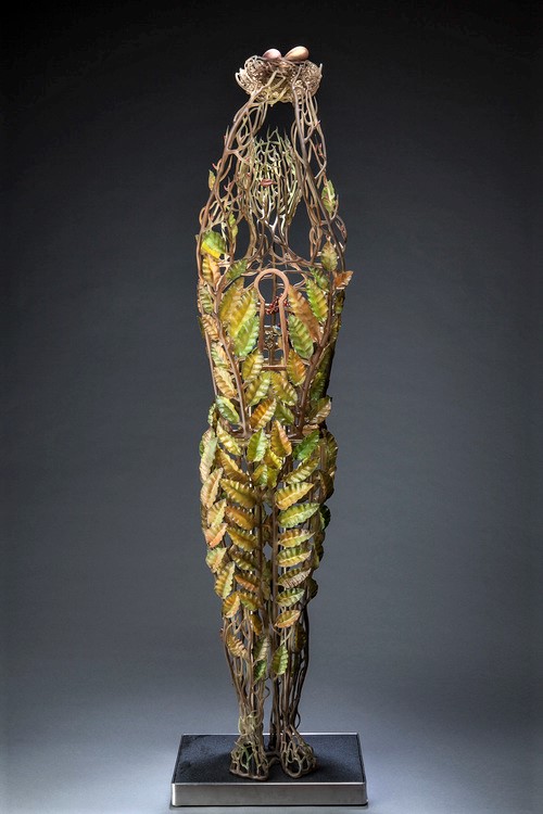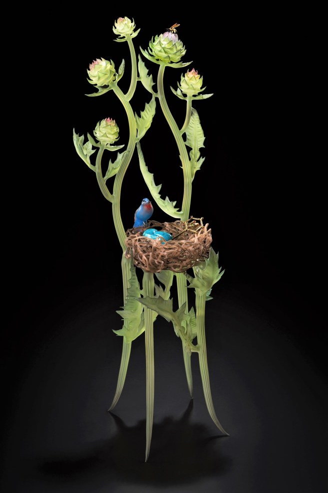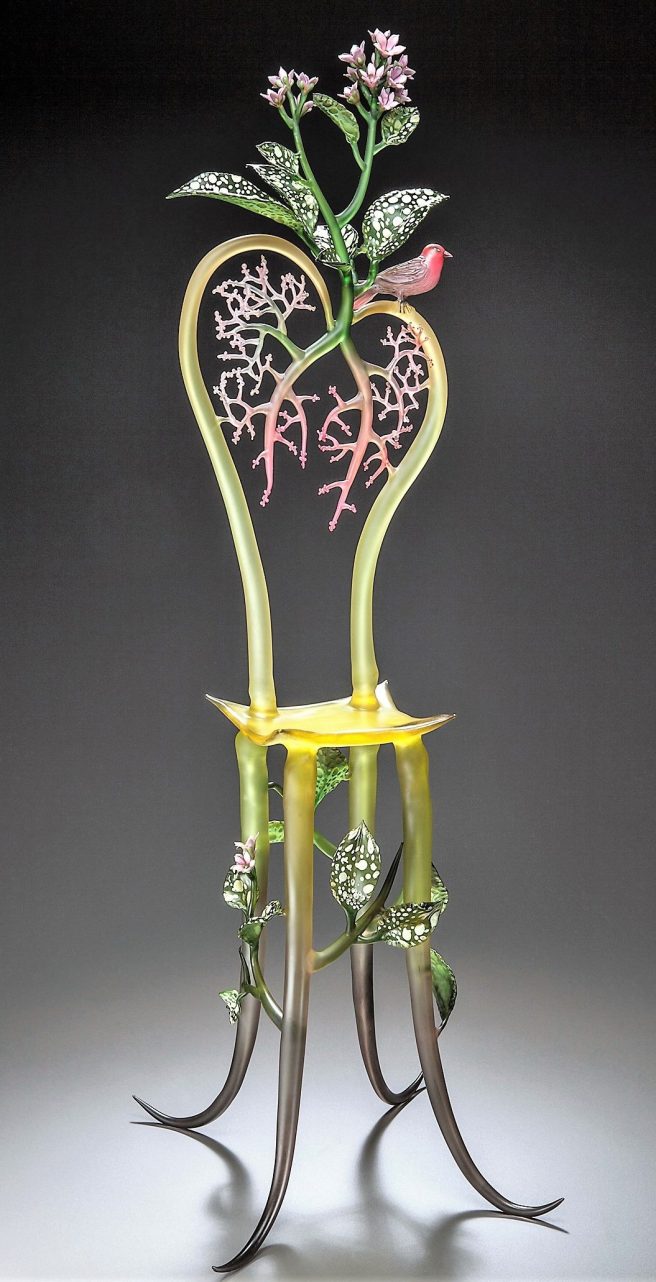 Her work often takes the shape of recognizable objects, like human figures and chairs, which are then filled with incredible detail. The artist uses borosilicate glass, and enhanced with glass colors, gold luster, sandblasting, and oil paint.