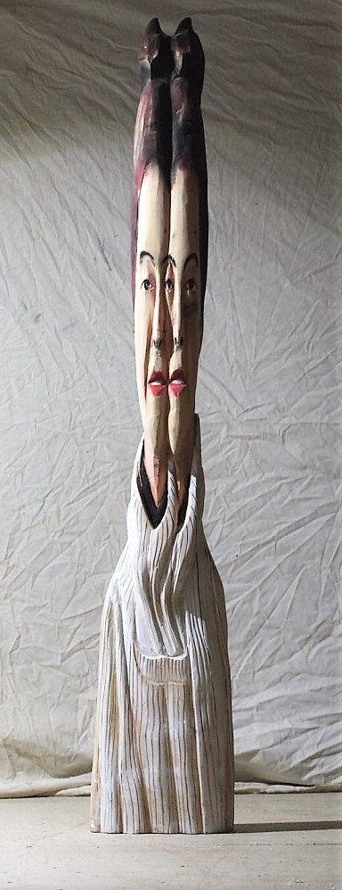 In some works, elements of the elongated sculptures are fractured, creating surreal doubling of torsos, heads, and arms.