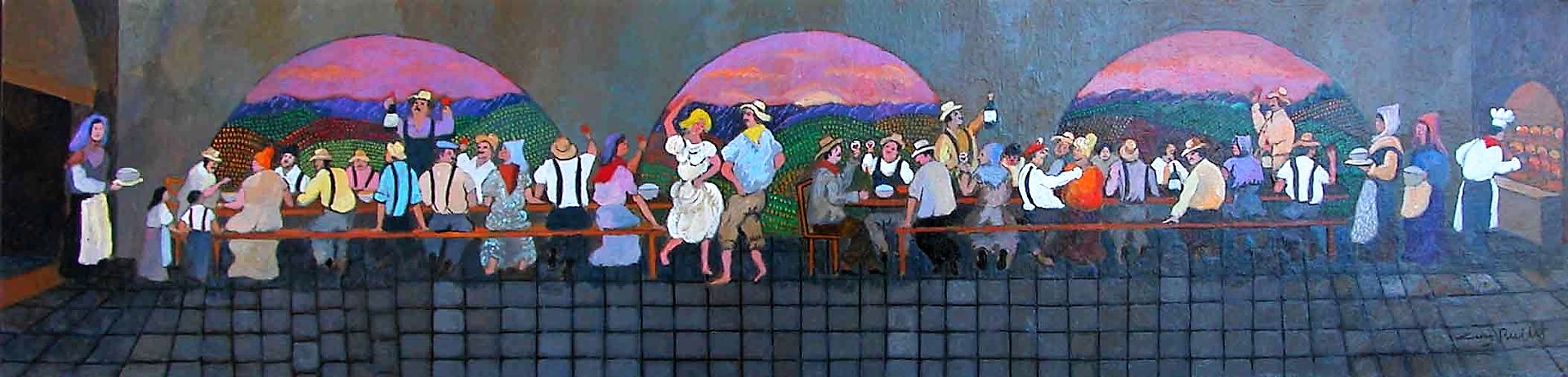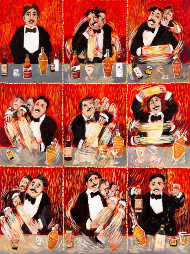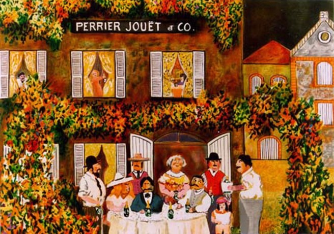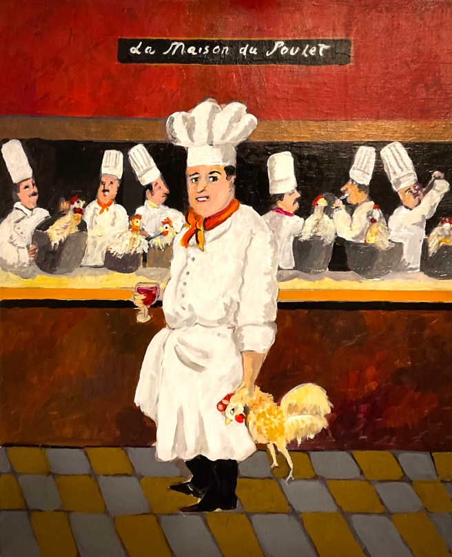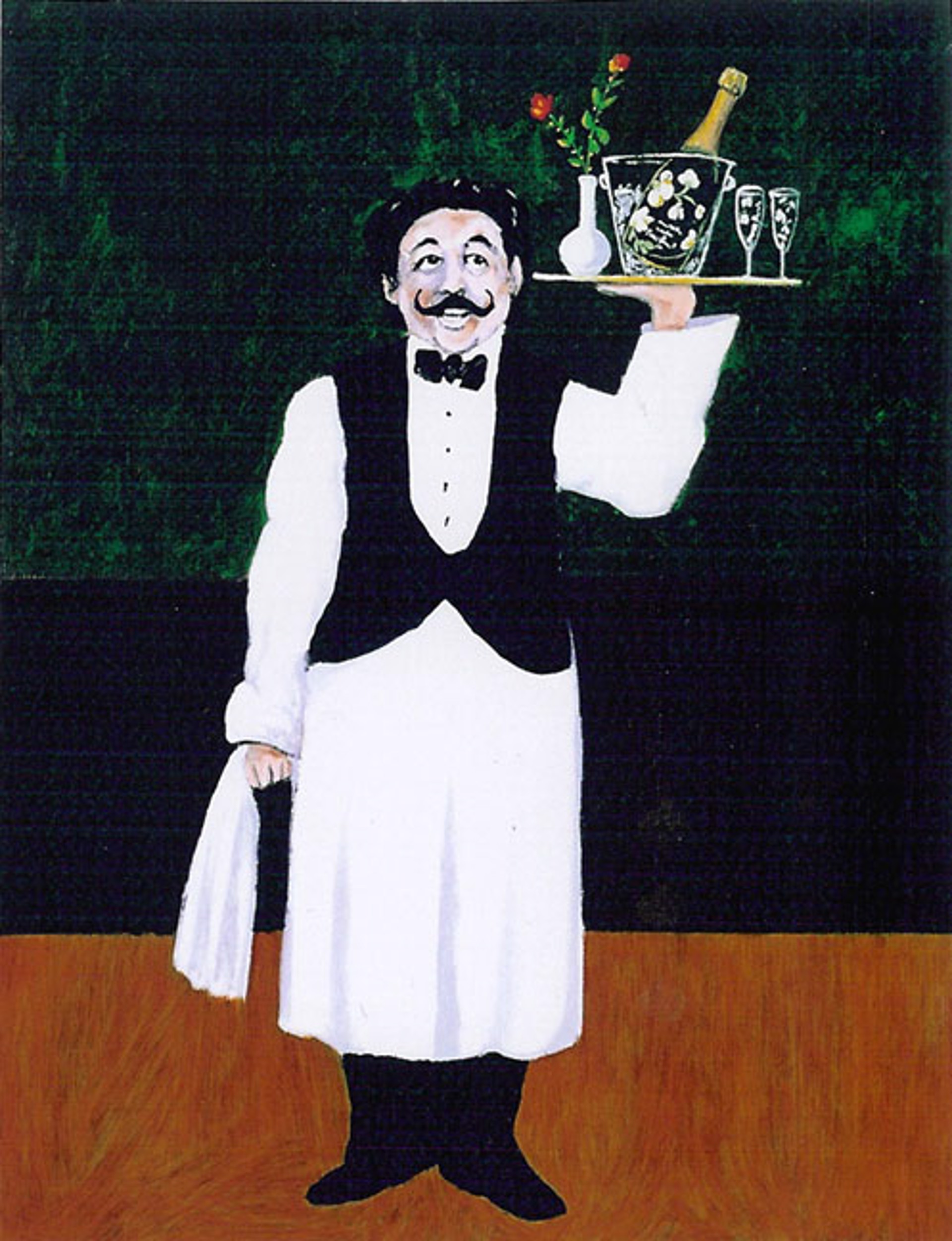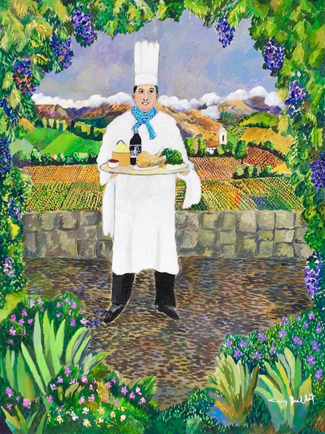 His whimsical rendition of sommeliers, chefs and waiters and other images are found not only in his paintings, but on every day items as dinner plates, napkins, tablecloths, and fashion.