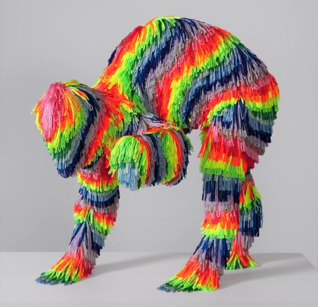 The core structure of the work is an anatomically correct to scale animal model, so the sculptures are, underneath, distinct animals like lions, foxes, and big cats.