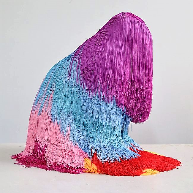 Through the process of building the colorful textile pelt, that very particular animal disappears and transforms into something less recognizable but still recognizably animal-like.