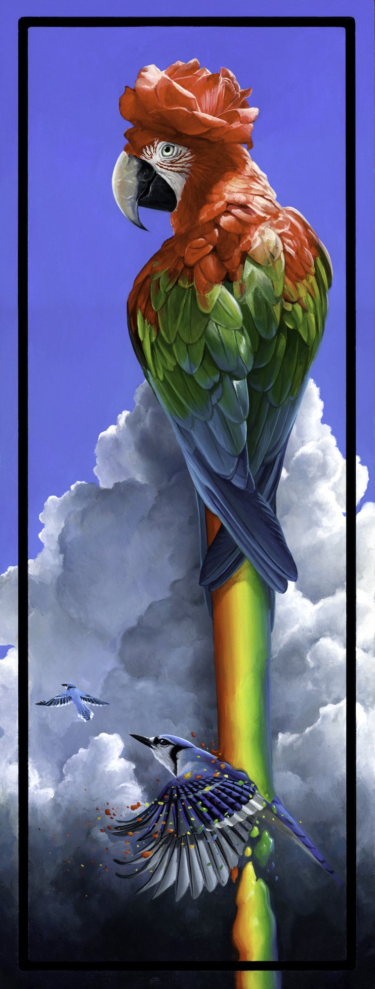 New creatures and symbioses emerge in his meticulously rendered oil paintings, exemplifying the endless potential of life on Earth through metaphor and allegory.