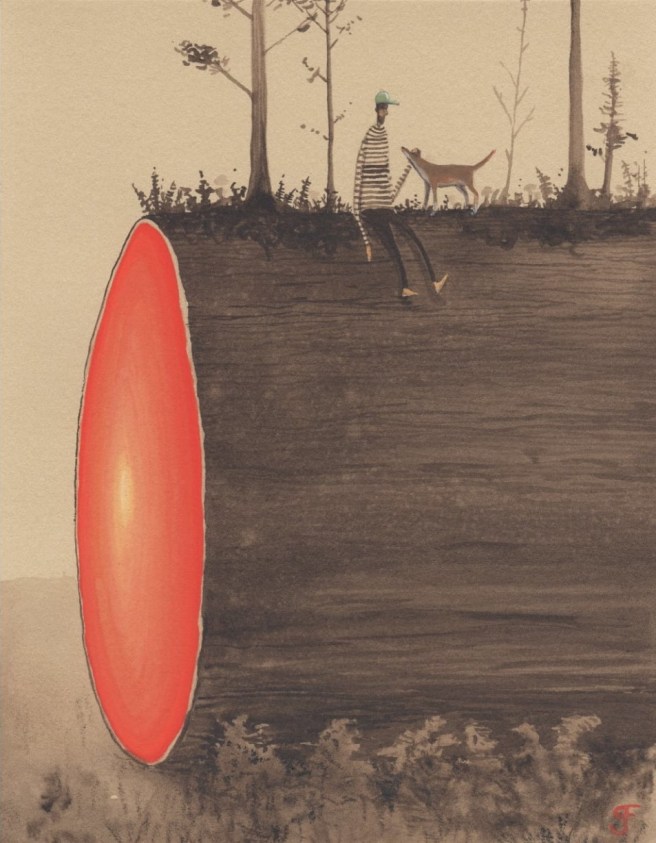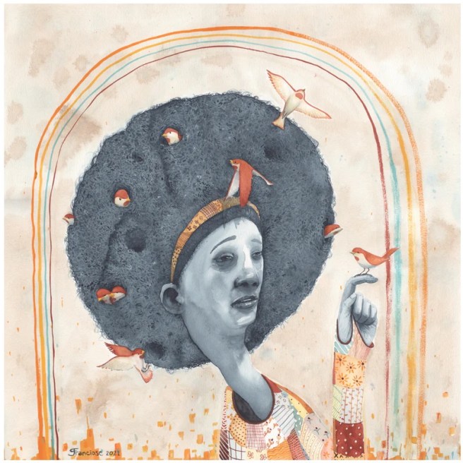 Trained in photorealism in a variety of mediums, Franciose studied Illustration at the Hartford Art School, and graduated with a BFA in Illustration in 2005.Franciose often sits down with watercolor, gouache, and a small sheet of cotton paper to paint a whimsical scene or surreal moment.Dreamlike in style and subject matter, the works are part of an ongoing series simply titled ‘Morning Coffee Paintings.’An exercise in experimentation and releasing perfectionism, the paintings reflect a range of moods through mysterious scenarios and quiet, contemplative figures.His imaginative illustrative paintings are small in size and big on emotion, each depicting its own little narrative, often dreamily reminiscent, reaching deep into the human condition and showing us all little pieces of ourselves along the way.Franciose’s work deals with the quiet moments in a story, between the excitement and action where characters deal with internal conflicts, doubt, loneliness, wonder, and apprehension.“My work often comes across as sad and melancholy, but there is always a sense of hope that I am trying to portray,” the artist shares.“I try to keep the meaning and scenario of my work open ended so each viewer can interpret the narrative in their own way.“There is a story in there, but it’s up to you to decide what it is.”