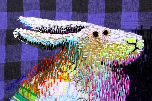 Her technique includes combining loose satin stitching embroidery with painted, appliqued, patched and corded pieces.