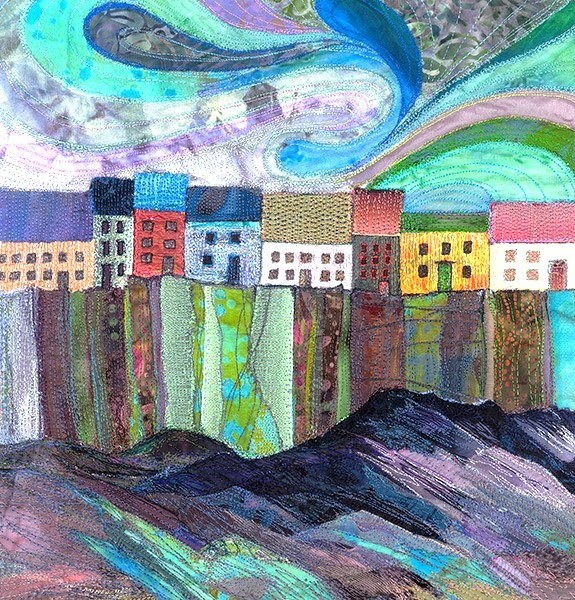 The shapes, colors and details of these subject matter are then borrowed and echoed in delicately hand or machine embroidered fabric collages using vibrant threads worked onto papers and fabrics.