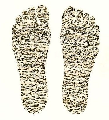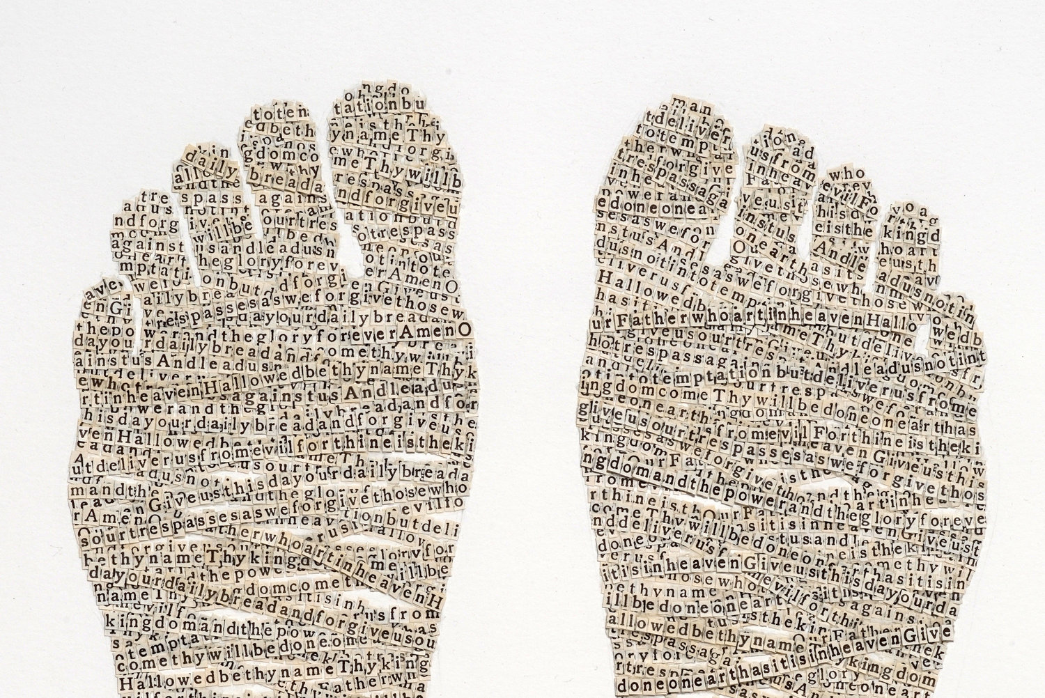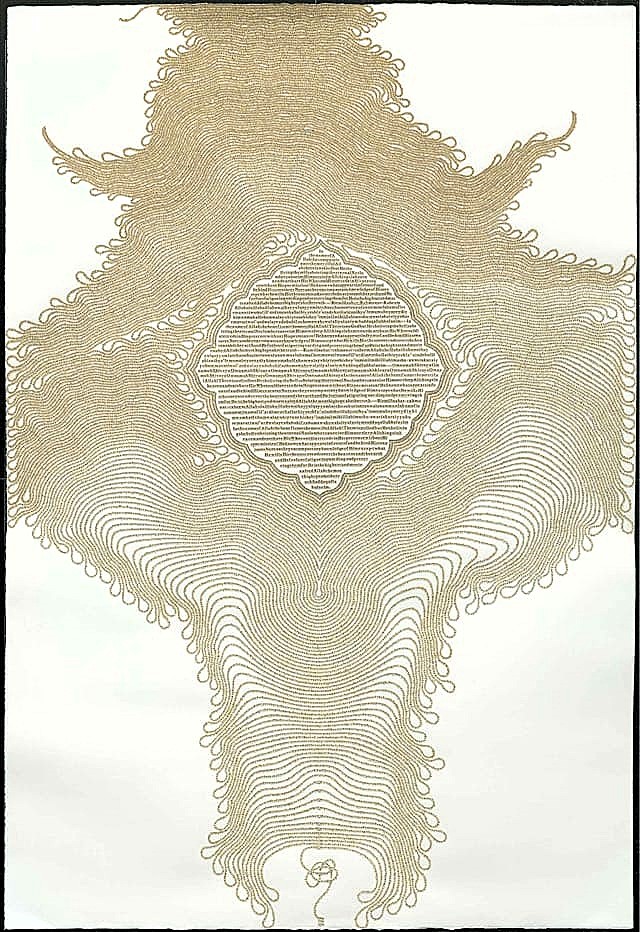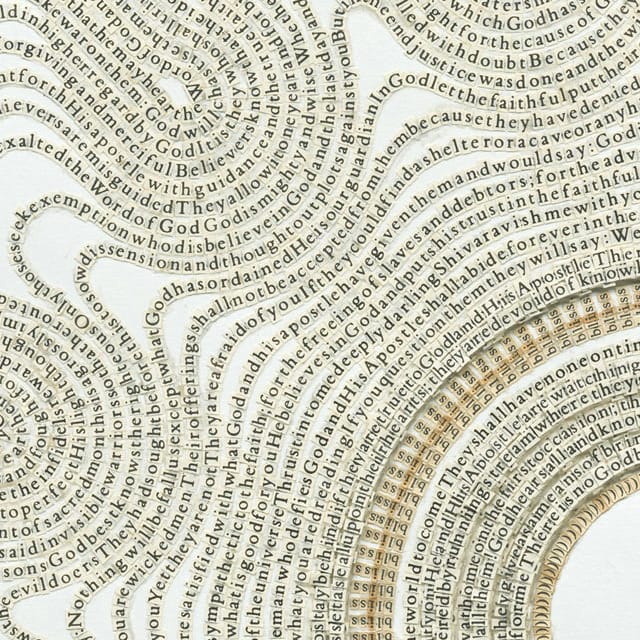 “I combine sacred texts with painting, sewing, and burning, rendering a contemporary interpretation of an ancient tradition,” the artist shares.