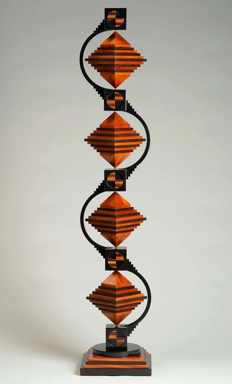 Whitehead’s body of work mainly consists of totemic sculptures built from fine-grained wood and mirror-polished stainless steel sculpture with varying geometric shapes, repeated forms, and negative spaces.