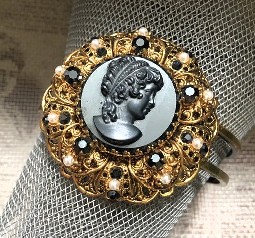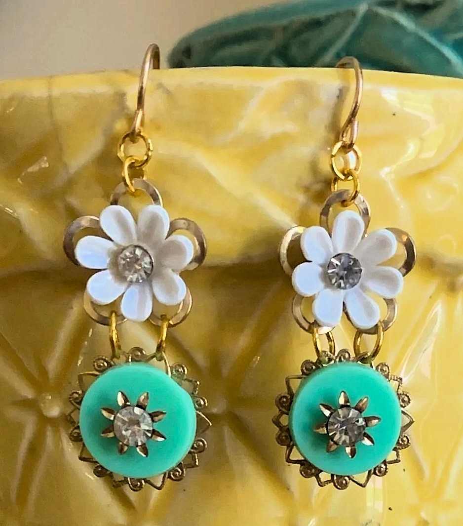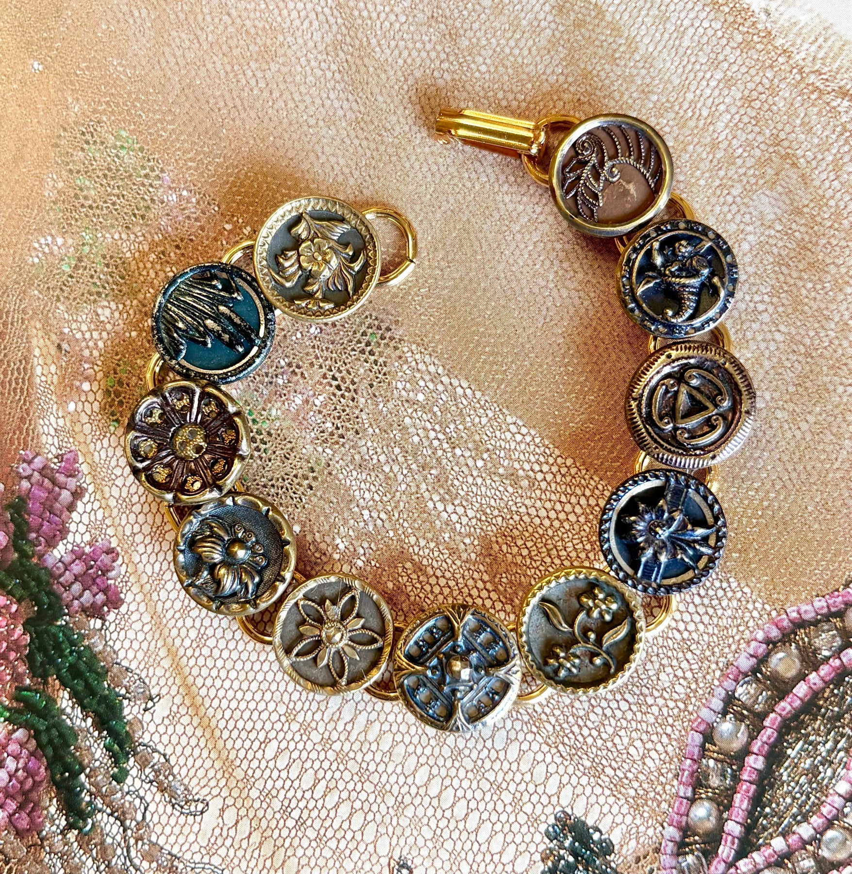 Since then, she has been designing jewelry using antique and collectible buttons and has expanded her work to include handcrafting new pieces from well-loved vintage remnant pieces.