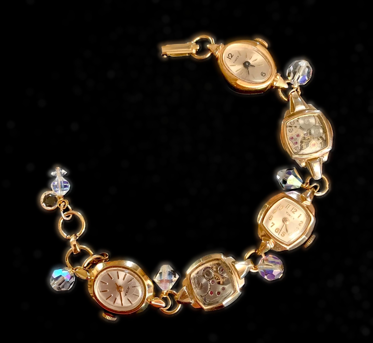 the watch face bracelet; I went to a vintage thrift store (ages ago) bought ALL their non-working watches and made earrings and a bracelet out of them!