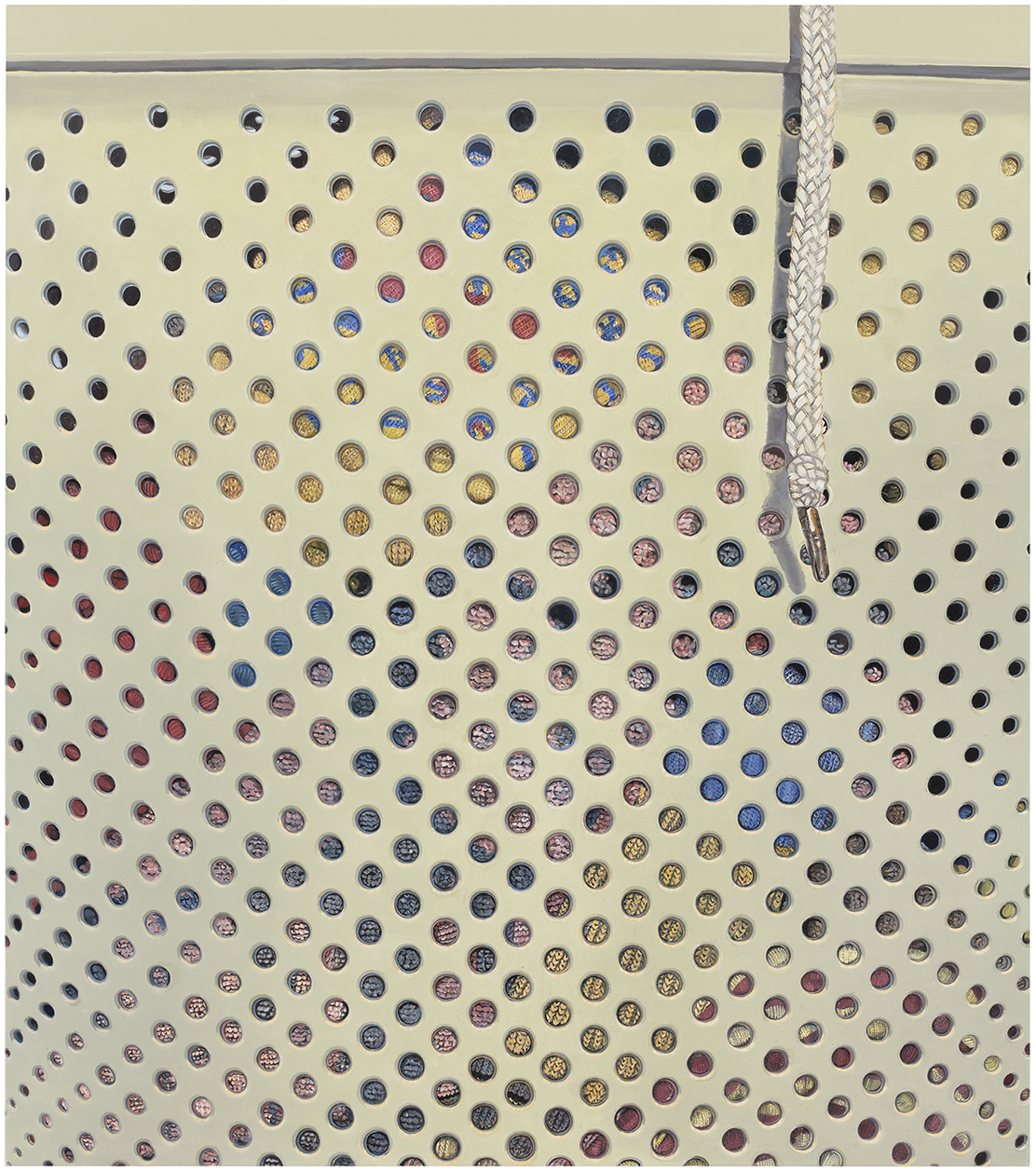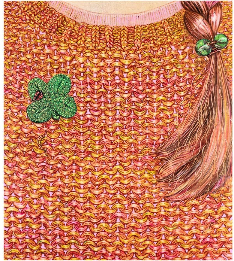 Often her paintings look like blown up photos of knitted sweaters, needlepoint and buttons.