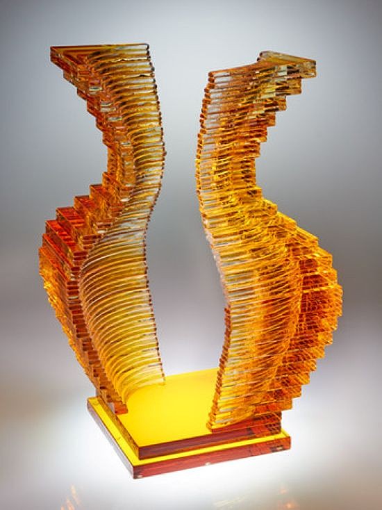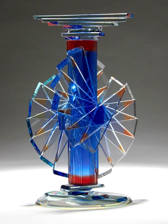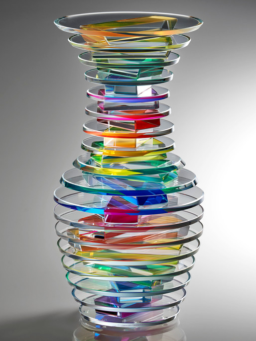 With a combined use of rough or highly polished glass surfaces, along with specialized pigmented adhesives, Hutter creates three-dimensional sculptural objects in which the intersection of form, glass, color and light unite to create works of art with an amazing and ever-changing spectrum of color, reflection, and refraction.