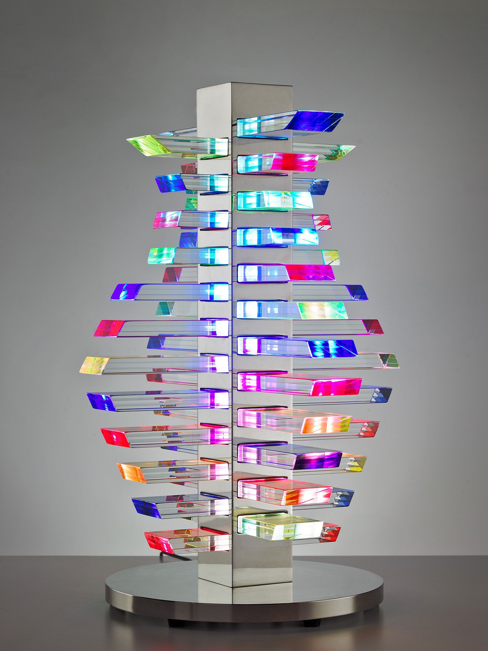 Using commercial plate glass, adhesives that react to ultraviolet light, and vibrant pigments, the artist creates mesmerizing sculptures that respond to light and movement.