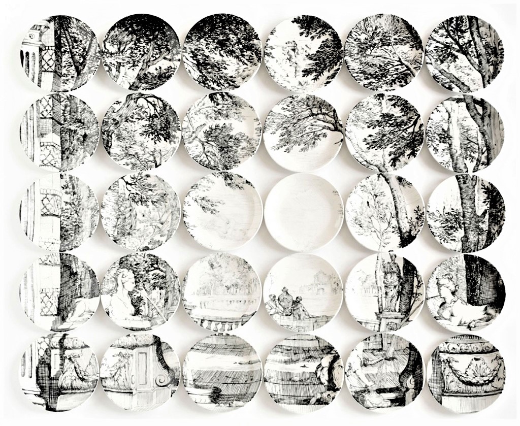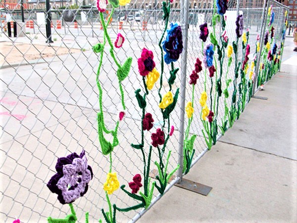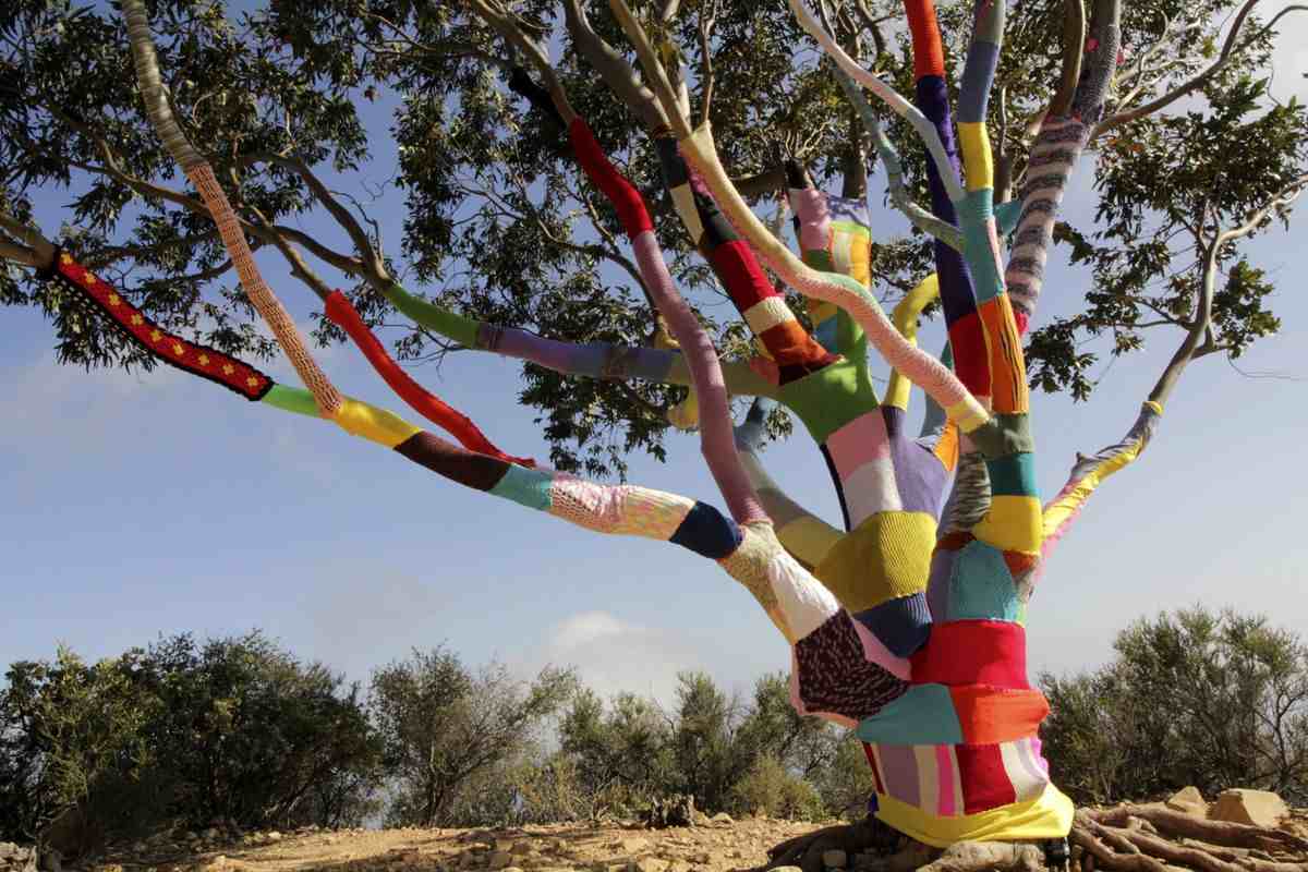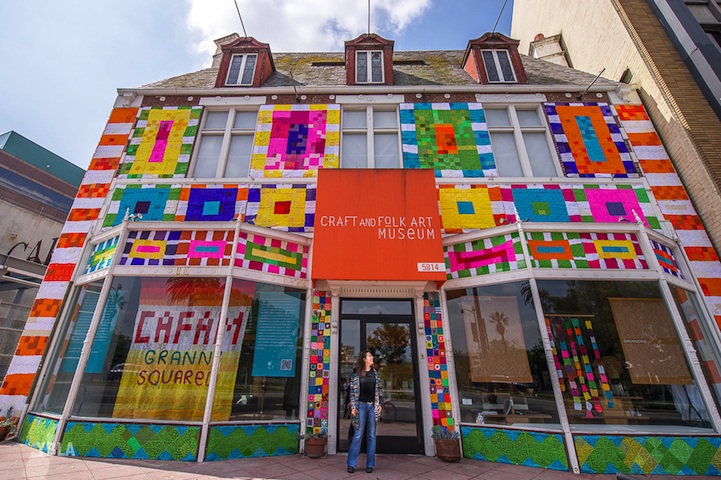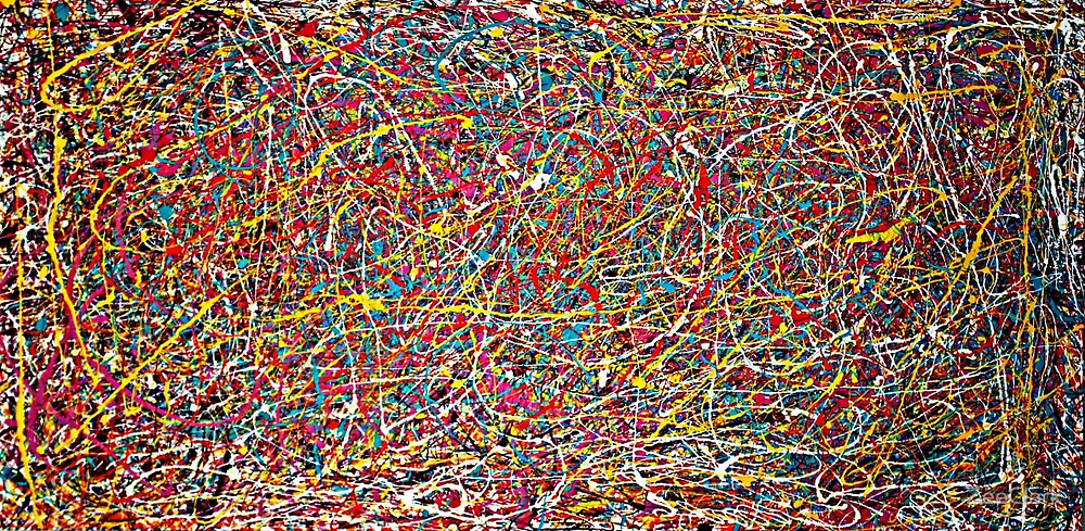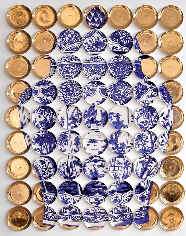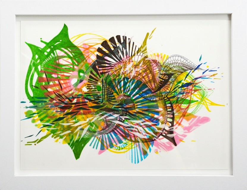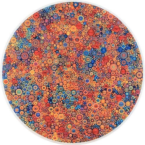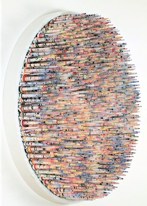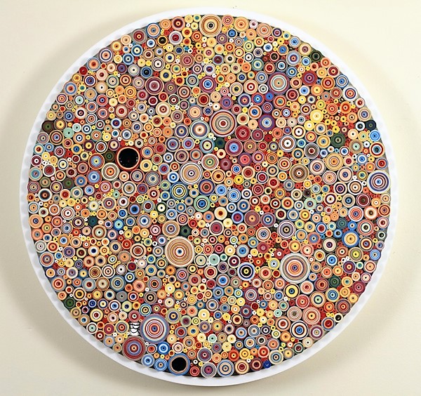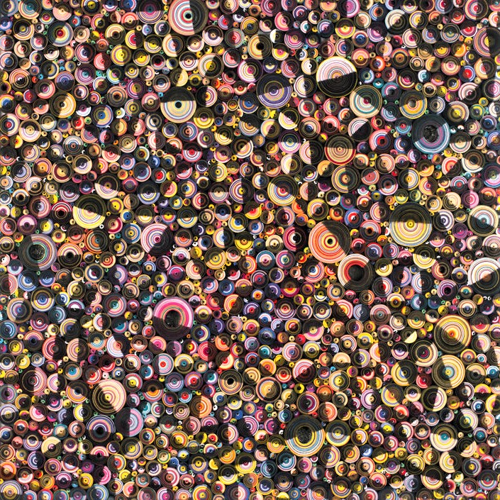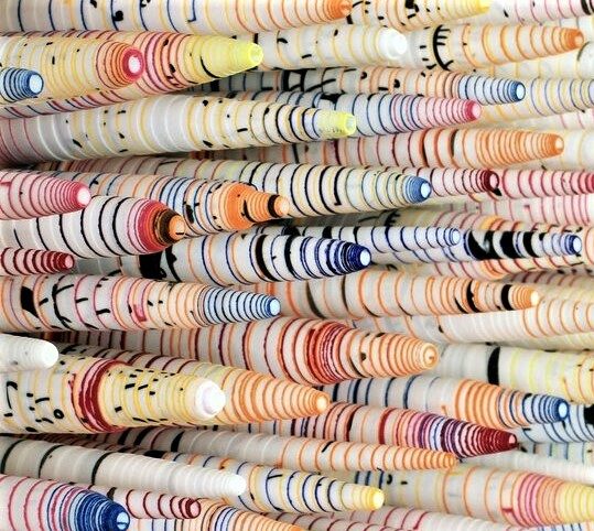 Swirling maelstroms of color and texture are formed from quotidian objects: Plastic dollar store items like cheap tablecloths and straws.