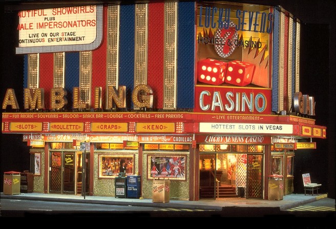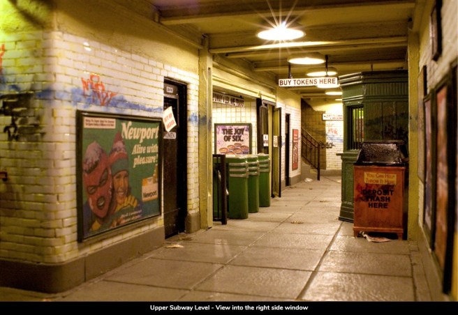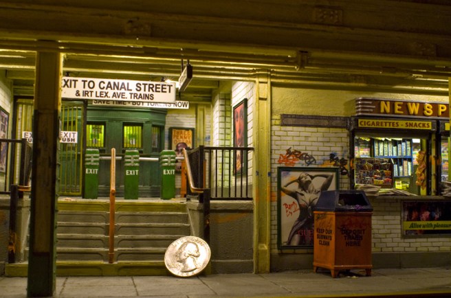 Wolfson usually works in ½ in = 1 foot scale, which is half the size of dollhouse scale. The first few pieces Wolfson did were in dollhouse scale, but he decided to change to the smaller scale so he could build more intricate environments in the same-sized space.