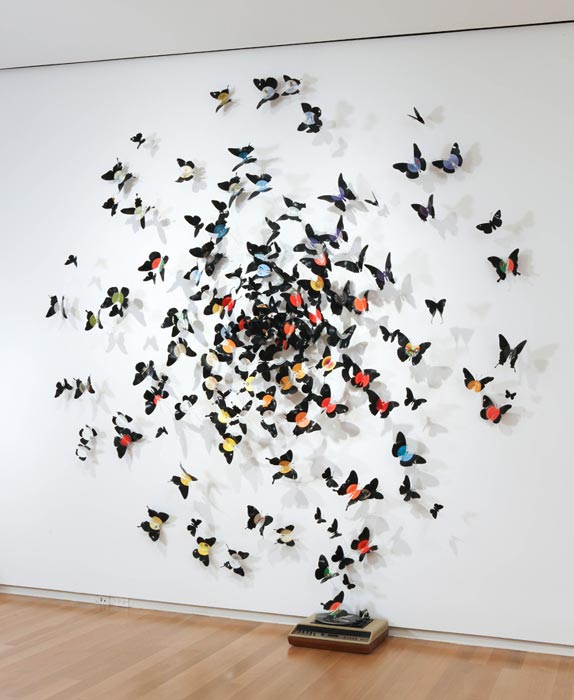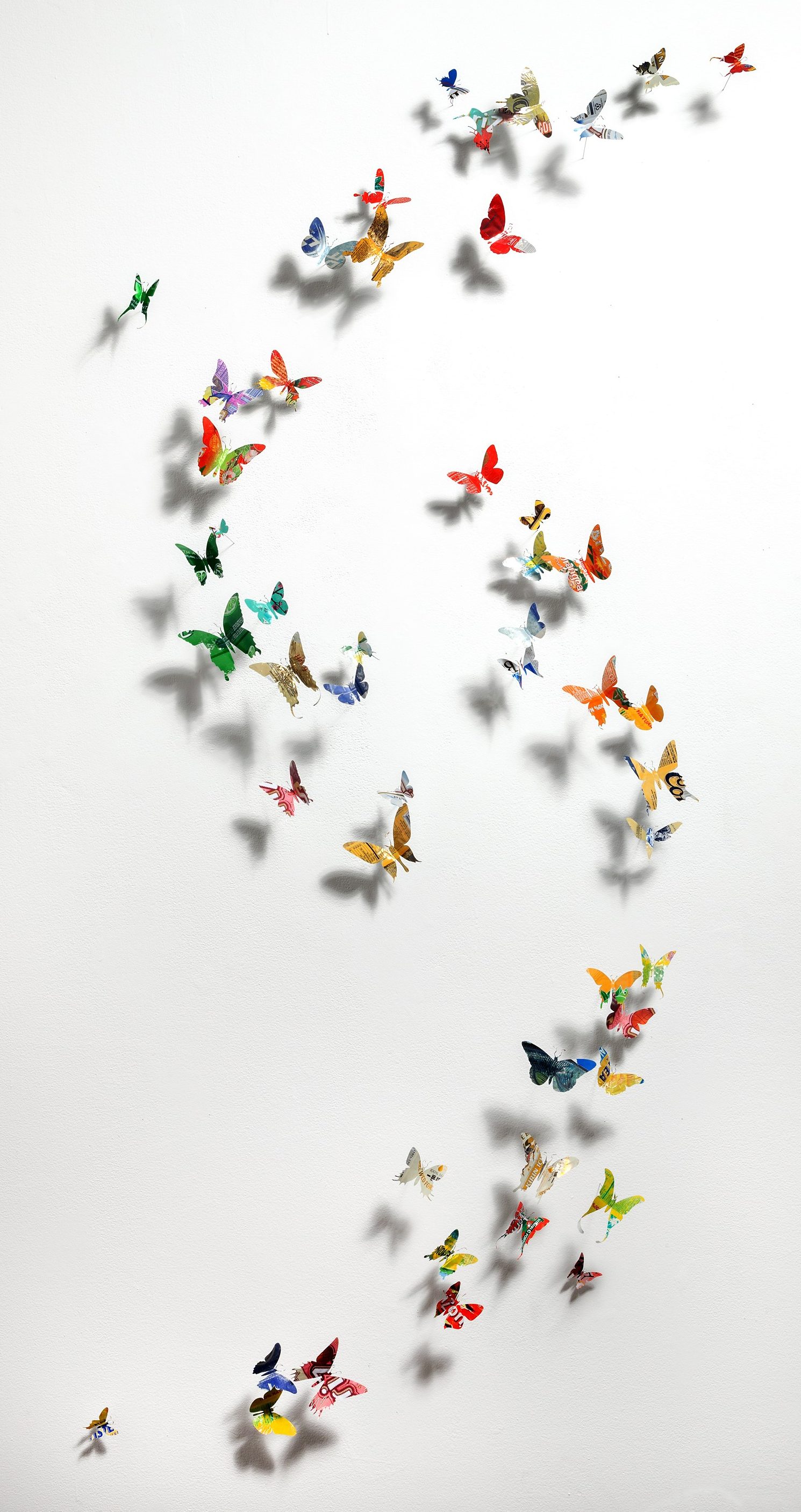 His primary muse has taken the form of butterflies rendered in multiples as they swirl across walls or carefully organize into shapes.