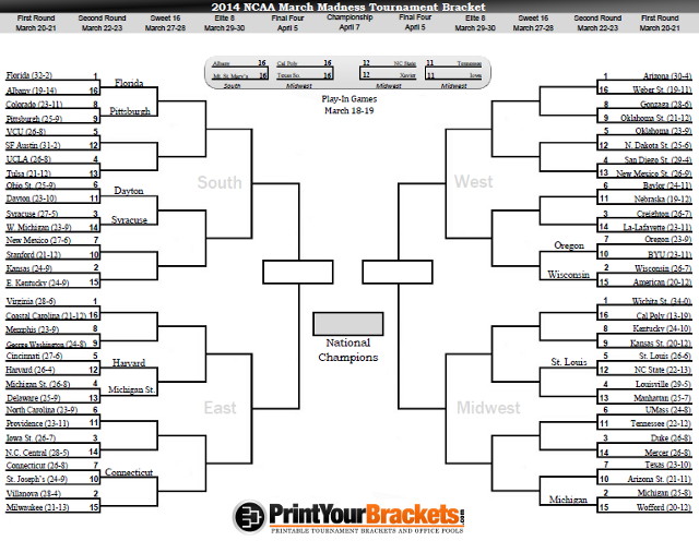 Have you ever seen these diagrams designed by the left hand of God? They look like a spider’s nest. 64 perfect little lines connected 2 at a time, narrowing down to 32 little lines, narrowing down to 16 little bigger lines which break down to 4 decent sized lines which flip into 2 important lines that poke into a big box from either side that will hold the logo of the winning team. You need a magnifier to read the teeny type on the 64 lines, and and patience to finally narrow it down far enough so you can thread the needle into the box.