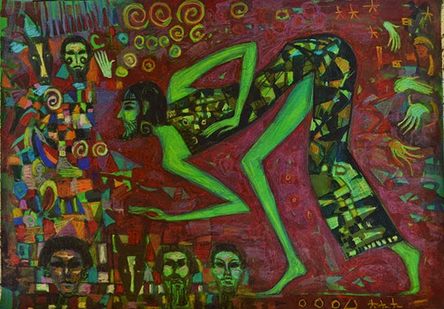 His work is characterized by intricate layers of color, symbols and letters that convey universal messages about coexistence, peace and freedom.