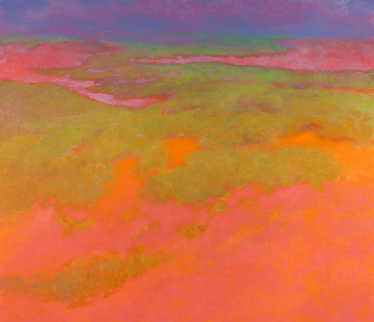 At times, they are electric shocks of violet, magenta, neon green, pink, and goldenrod, resembling negatives for color photographs. In other canvases, they are hazier tones of the same shade that bleed into each other.
