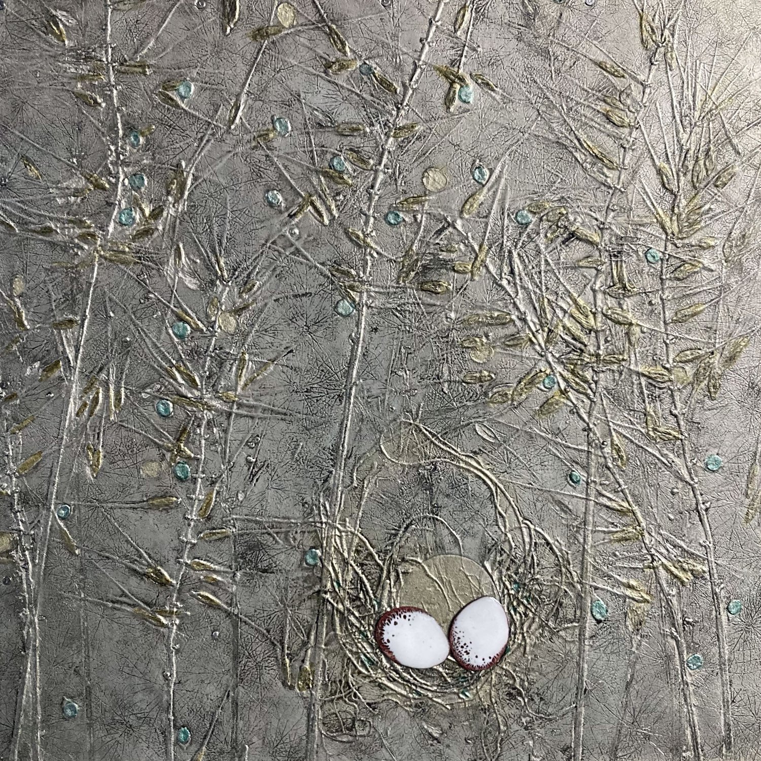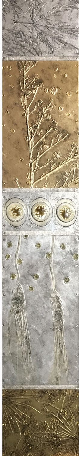 Sutherland’s art is created out of a sheet of pewter, which is manually rolled through an etching press layered with petals, seeds, and wildflowers.