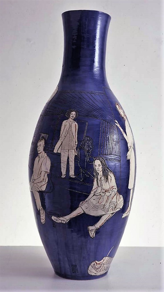 Holt carefully incises shallow cuts out of the smooth surface of a glazed pot, revealing the outlines of figures, animals, plants, and landscapes.