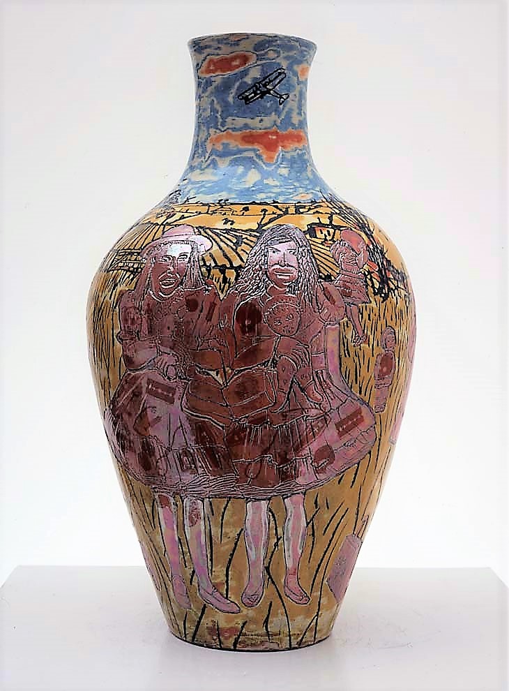 Holt carefully incises shallow cuts out of the smooth surface of a glazed pot, revealing the outlines of figures, animals, plants, and landscapes.