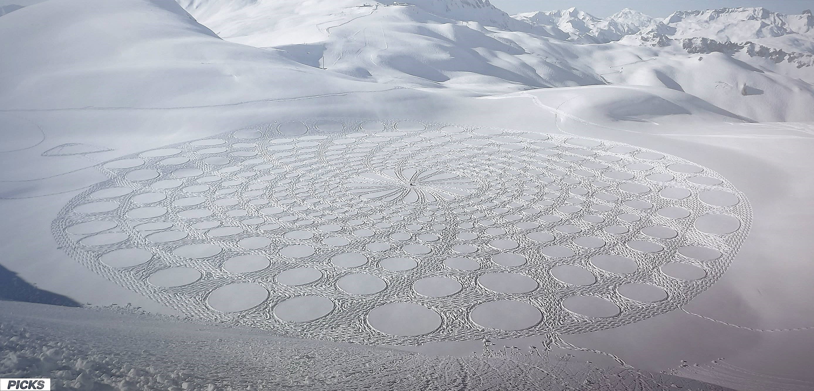 More of Simon Beck‘s snow work can be found at https://www.instagram.com/simonbeck_snowart/ and https://artincontext.org/simon-beck/.