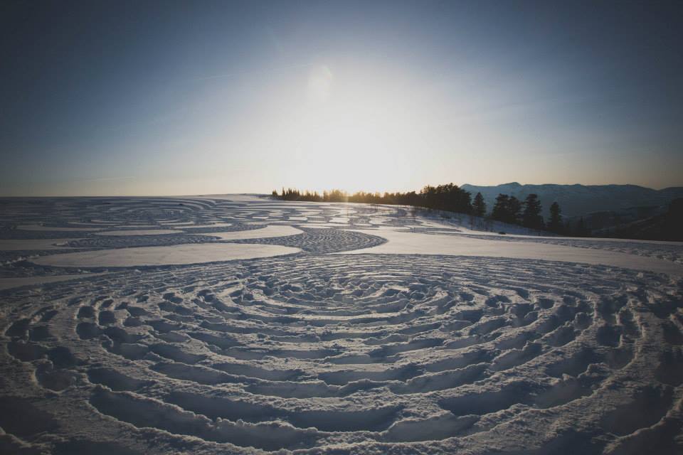 Simon first draws the patterns on paper and then using a compass and measuring tape, string, and an anchor with a clothesline attached, Simon paces the snow creating curves, triangles, geometric swirls and complex configurations.