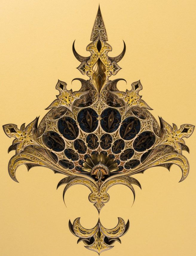 The artist says his inspiration comes from the geometry found in Gothic and Islamic architectural ornamentation which he somewhat jokingly calls “folk math.