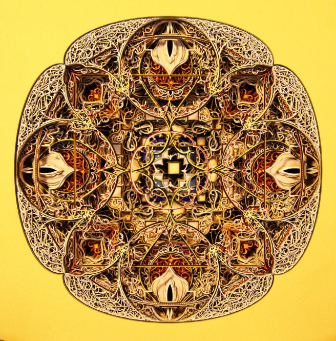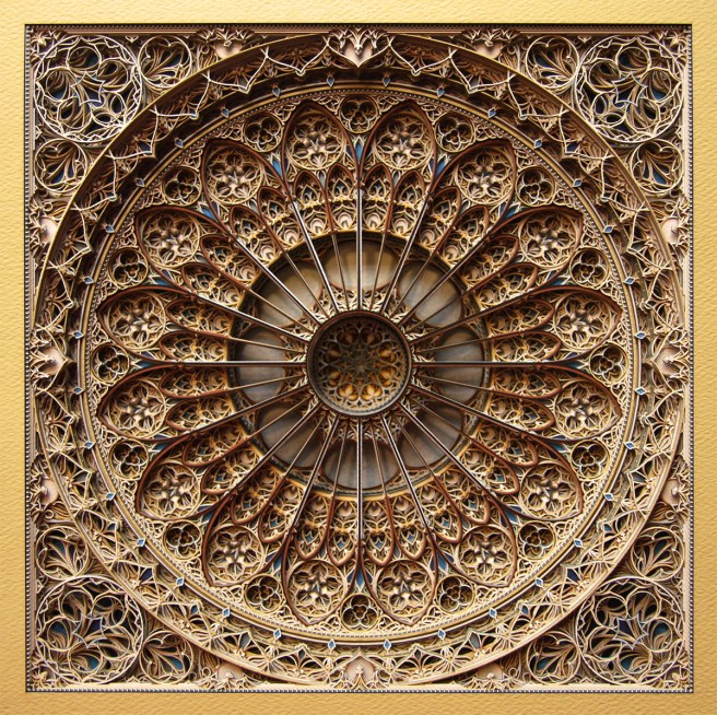 Standley  brings a whole new the term “cutting edge” with his methodical stained glass windows created entirely from laser-cut paper.