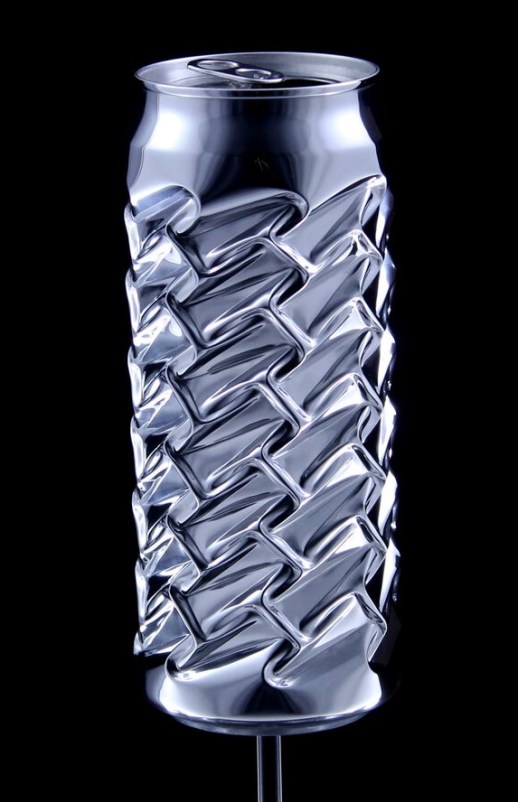 His blank canvas begins with a simple beverage purchase; it is stripped of its painted exterior using a special acid wash, leaving a shiny silver face for his sculptures.
