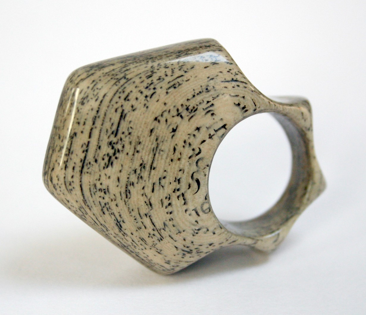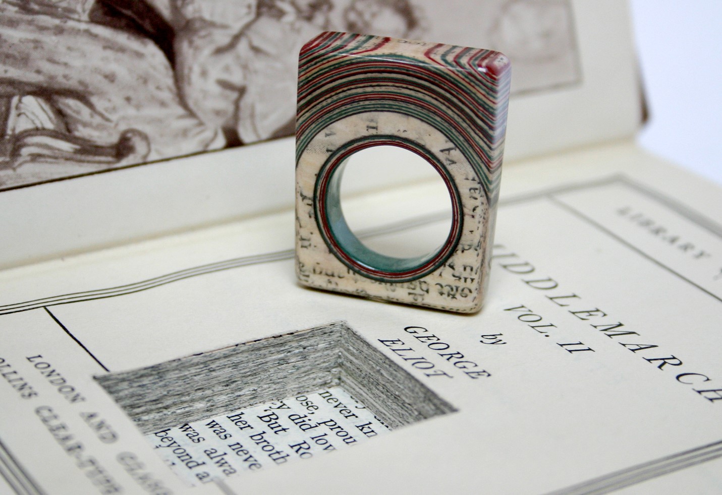 The rings may lose the words and image of the original book, but May keeps references with photographs and copy of the ring’s former life.