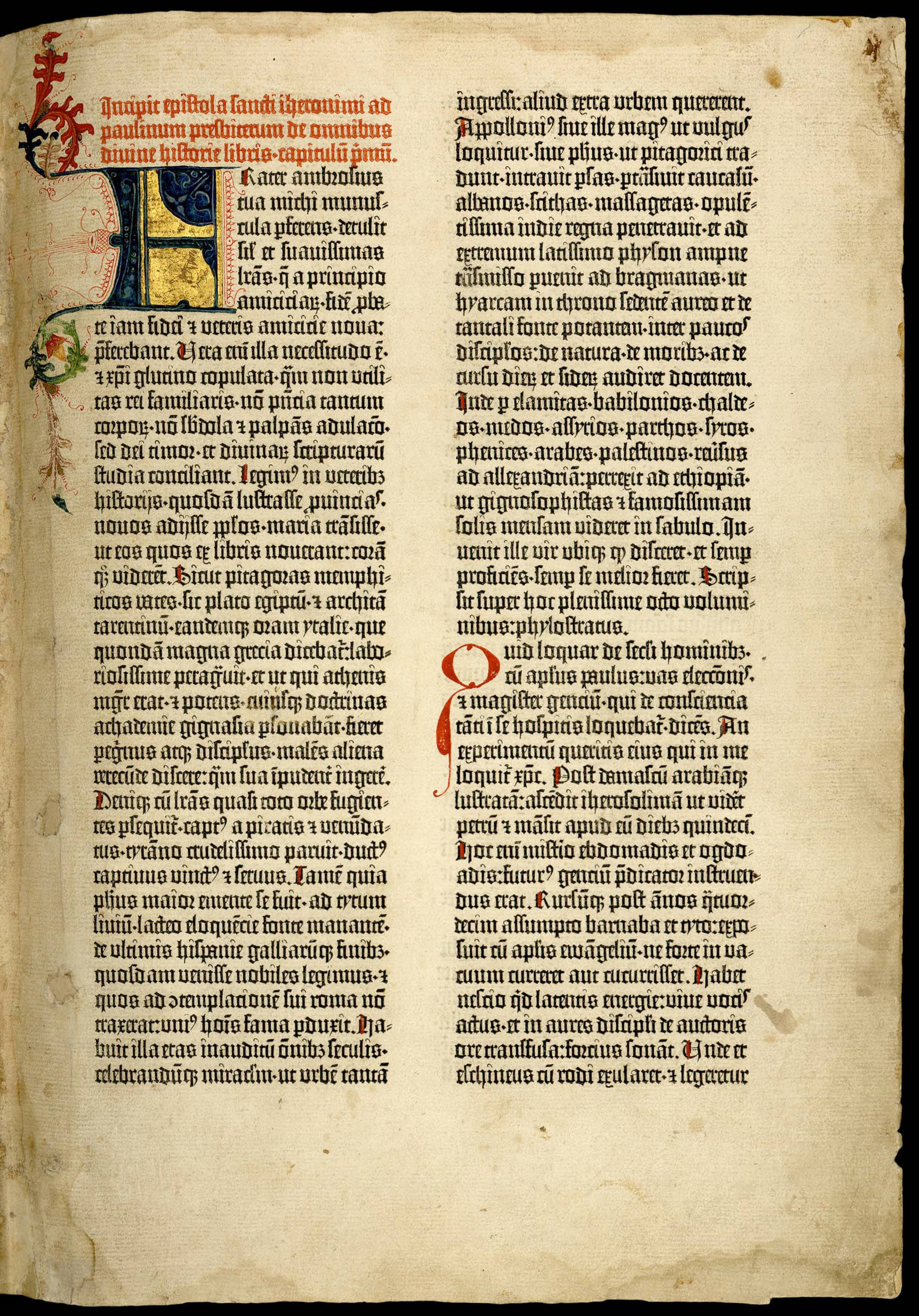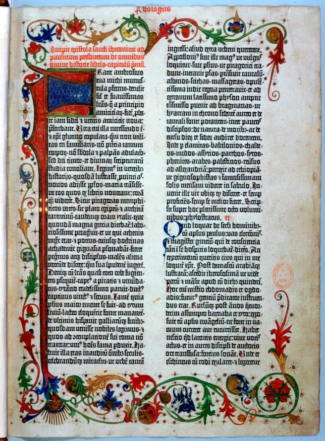 The Gutenberg Bible (also known as the 42-line Bible, the Mazarin Bible or the B42) was the earliest major book printed using mass-produced movable metal type in Europe. The text is St. Jerome’s Latin Vulgate version, prepared by biblical scholars of Paris in the 13th century in an effort to produce a consistent and useful Latin text.