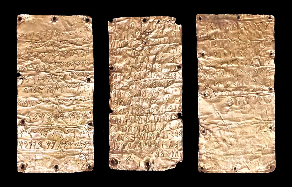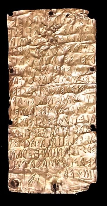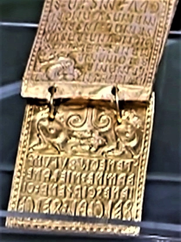 The six sheets are believed to be the oldest comprehensive work involving multiple pages. The illustrated six golden pages are made of 23.82-karat gold (measuring 5 centimeters in length and 4.5 centimeters in width) and fastened together with gold rings. The pages are covered with text and decorated with images of warriors, a horseman, a Siren, and a lyre. This work was written in Etruscan, the language of one of Europe’s most mysterious ancient peoples.