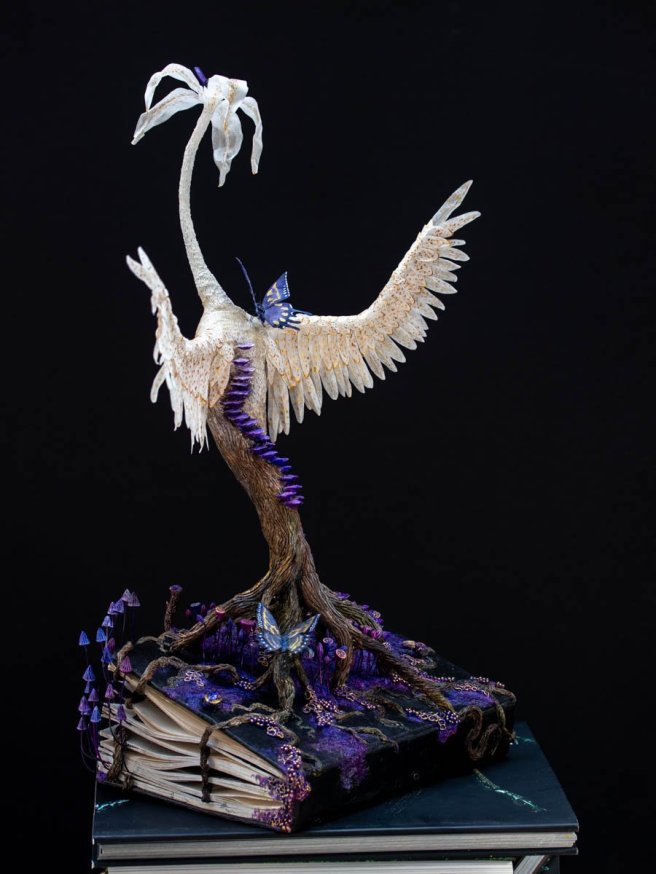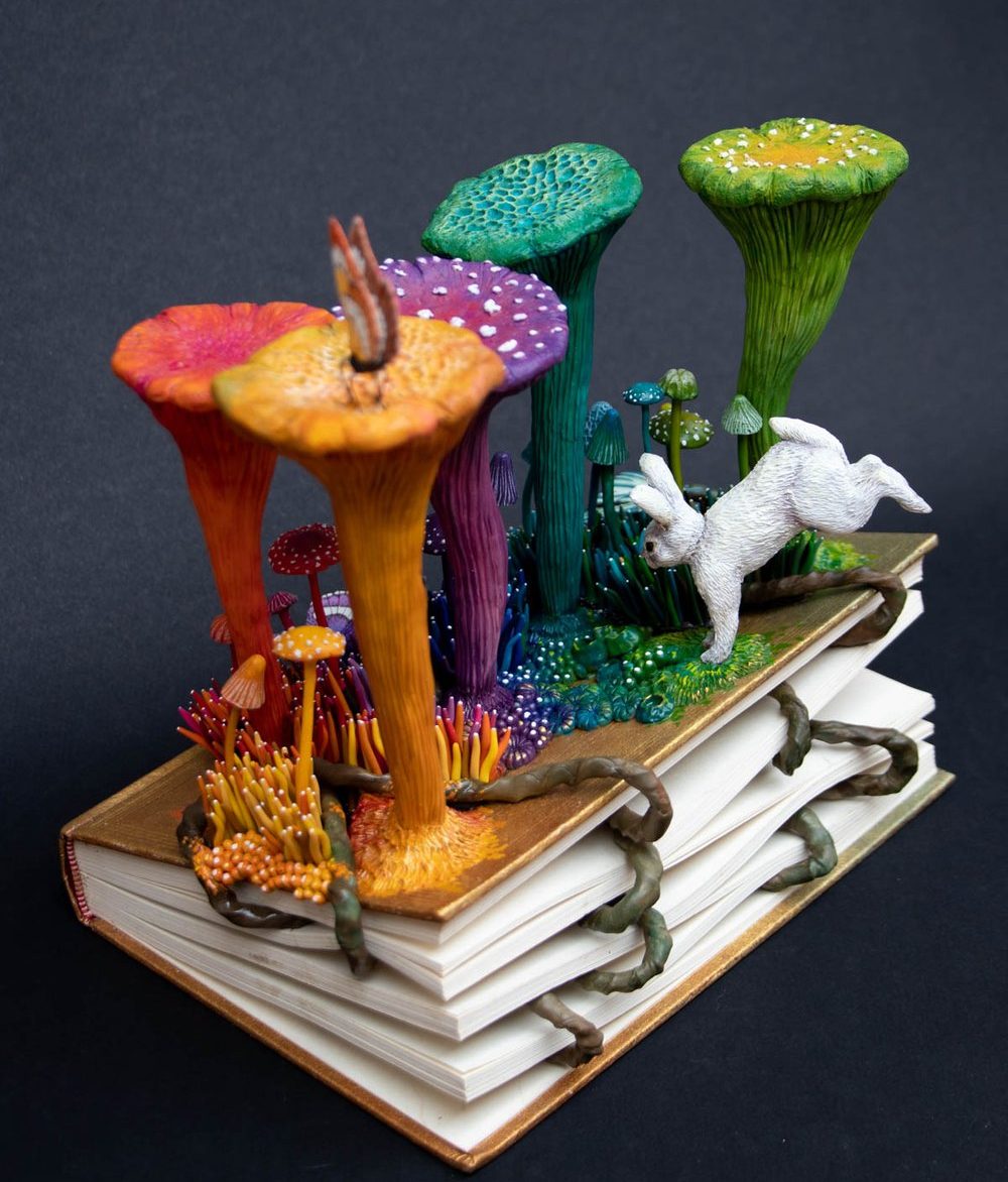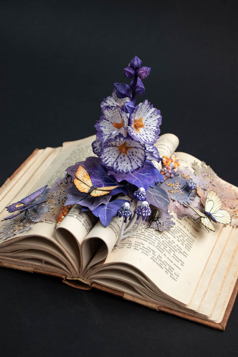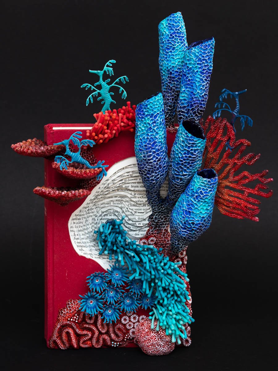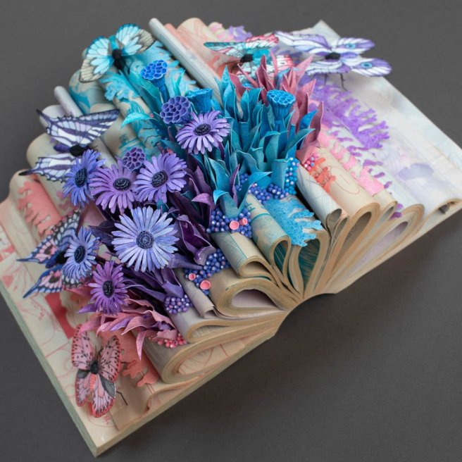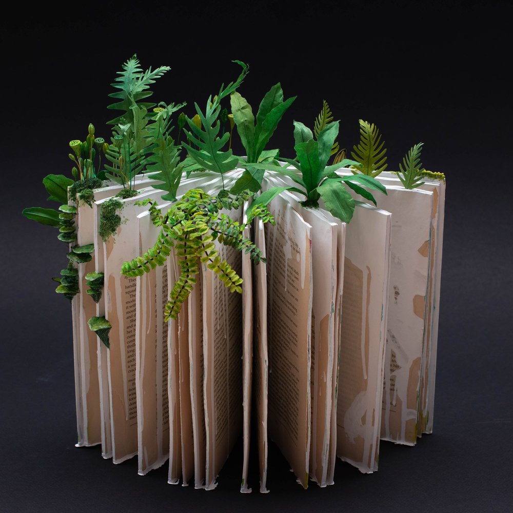 Her recent pieces explore incredible biodiversity utilizing books as her canvas.