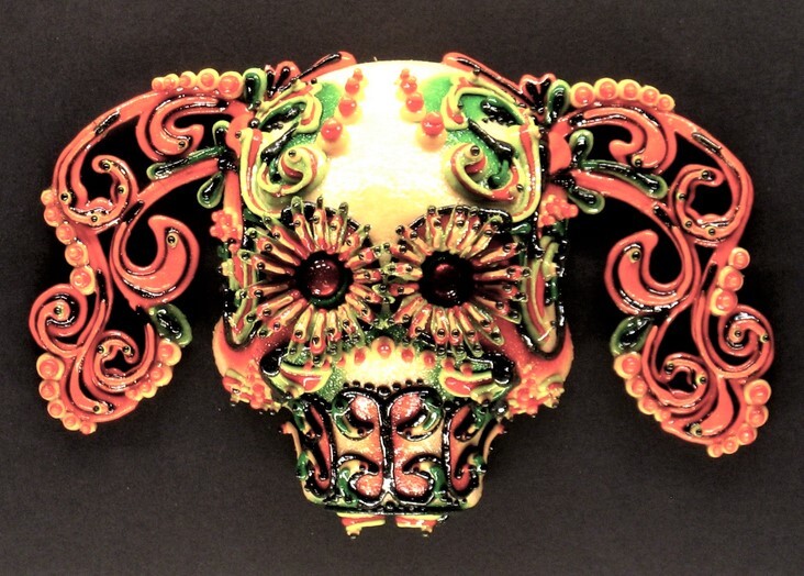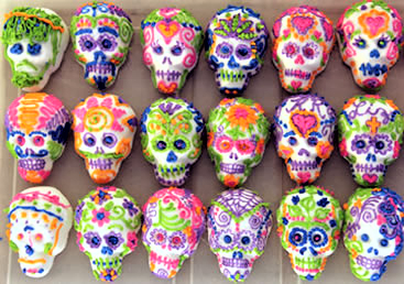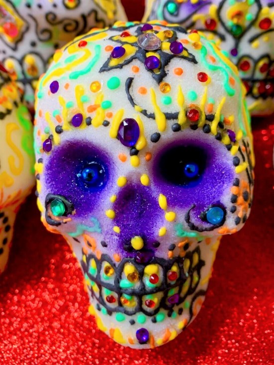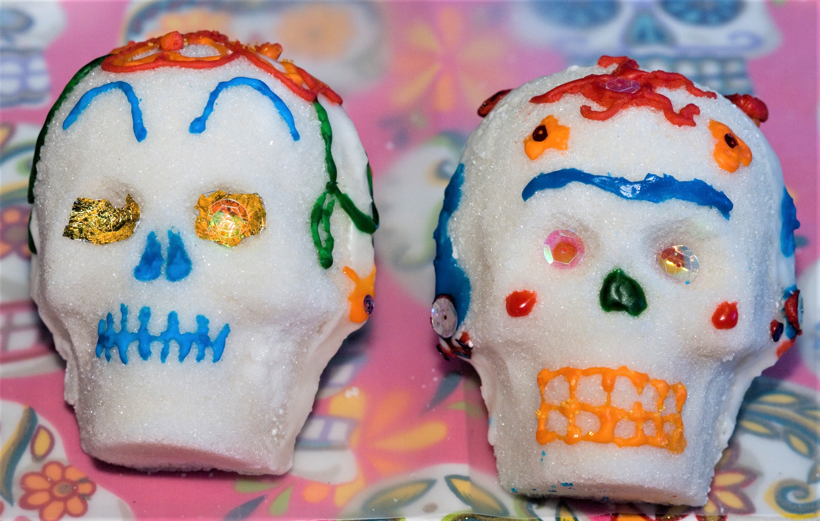 Traditional sugar skulls are made from a granulated white sugar mixture that is pressed into special skull molds. The sugar mixture is allowed to dry and then the sugar skull is decorated with icing, feathers, colored foil, and more.